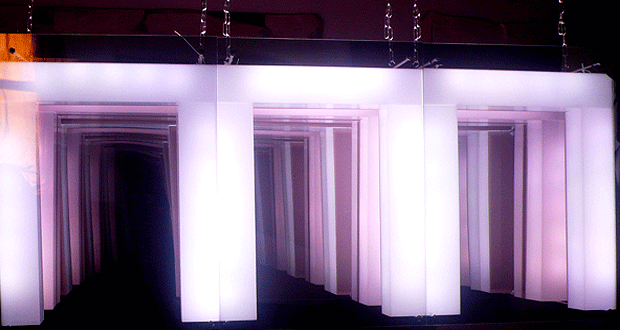 Dynamic, magnetic; the cascading hall of mirrors created by two layers of light work with concepts of balance between opposing or competing forces.